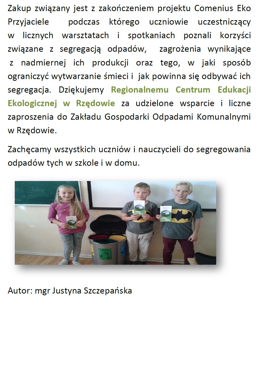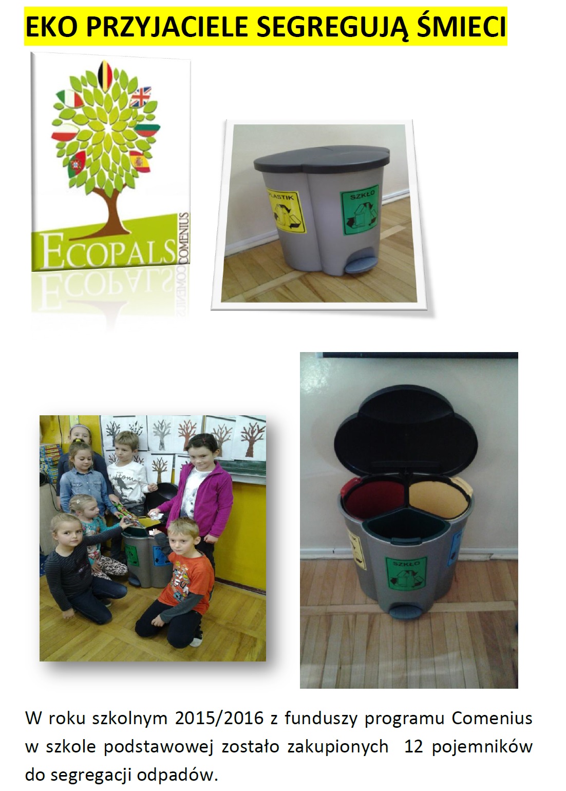 Współpracując ze Szkołą nr 2 w Staszowie mogliśmy przekonać się, jak wiele akcji proekologicznych jest prowadzone w tejże placówce, dzięki zaangażowaniu dyrekcji, nauczycieli i uczniów. Ostatnio korzystając z funduszy programu Comenius w szkole zakupiono praktyczne pojemniki do segregacji odpadów. Więcej na ten temat w artykule Pani Justyny Szczepańskiej, który prezentujemy poniżej.
